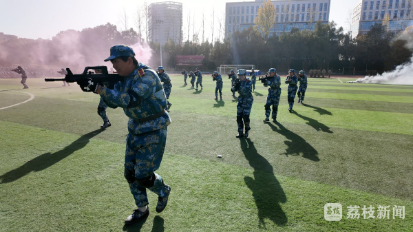 随后的男生战术表演,演练场上硝烟四起,学生们端着训练用枪,组成战术队形,在烟雾中依次掩护前进。