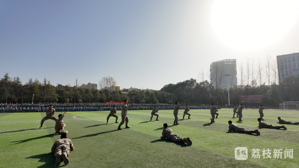 分列式后,进行了男生军体拳和女生匕首操表演,同学们动作整齐划一,力道十足,赢得现场观众阵阵喝彩。