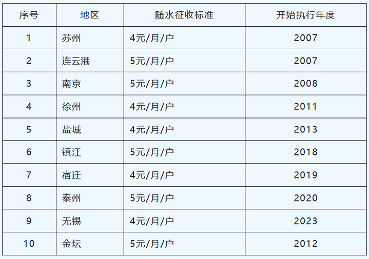 四是衔接周边城市。目前省内苏州(2007年)、南京(2008年)、徐州(2011年)、镇江(2018年)、宿迁(2019年)、泰州(2020年)、无锡(2023年)及我市金坛区(2012年)等地个人负担的生活垃圾处理费已改为按住户随水征收方式。