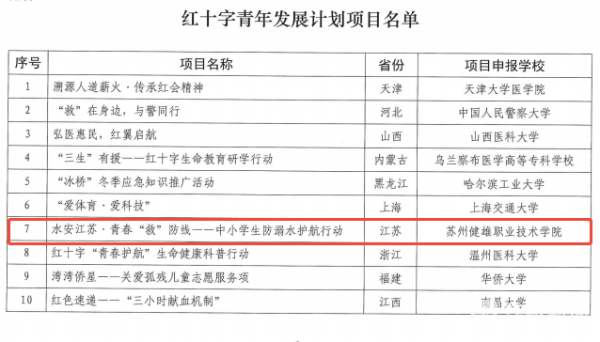 据了解,中国红十字会总会近日公布了2025年度红十字青年发展计划项目立项名单。苏州健雄职业技术学院经济管理学院志愿服务项目“水安江苏 青春‘救’防线——中小学生防溺水护航行动”成功获国家级立项。全国仅25个项目获此殊荣,也是江苏省唯一入选项目。活动精准聚焦中小学生溺水安全隐患,通过系统性培训有效降低青少年溺水风险,切实助力《“健康中国2030”规划纲要》中“保障青少年健康成长”目标落地见效,筑牢青少年生命安全防线。未来,该项目将进一步拓展线上教育、家长课堂等多元形式,实现“教育一个学生、影响一个家庭、辐射整个社会”的良好成效,为江苏水域安全建设贡献青春力量。