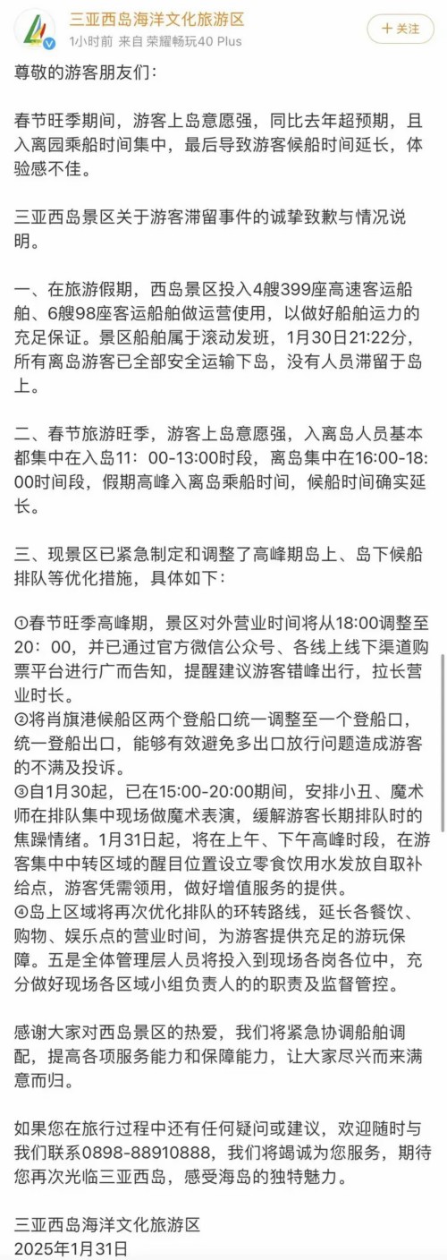 三亚西岛景区关于游客滞留事件的诚挚致歉与情况说明。