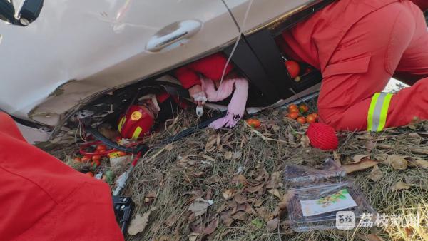 由于车辆仰翻车头变形严重,救援空间狭小,给救援带来了一定的难度。为避免给被困女子造成二次伤害,消防救援人员双膝跪地从后门车窗进入车内,清理后排杂物,增大女子腿部救援空间。