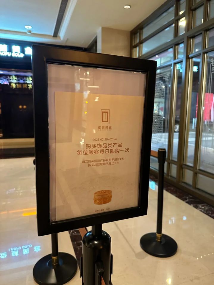 中国新闻周刊关注到,老铺黄金全国多家门店于2月20日发出了“2月25日前,饰品类产品每日限购一次、每次购买同款产品限购2件、购买总数限购5件”的通知。此举或有防范黄金代购的意味,老铺黄金店员表示:“这是为了让大家都能选购到心仪的商品。”