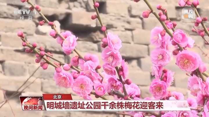 在北京明城墙遗址公园,簇簇梅花也已在枝头绽放。作为北京最大的梅花观赏地之一,这里汇集了50余个品种共千余株梅花。