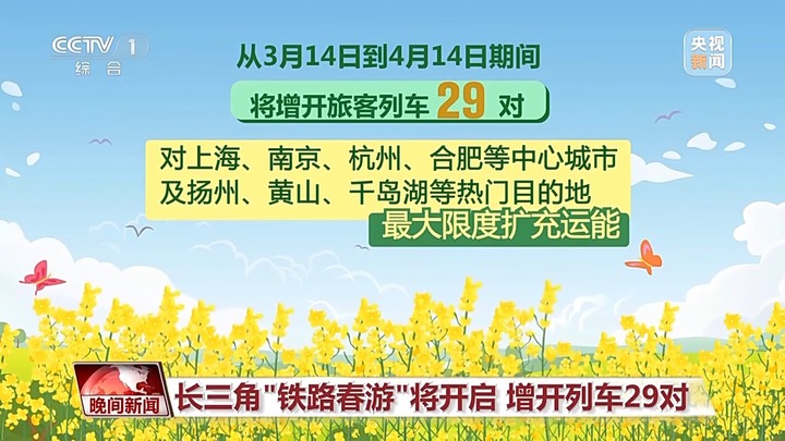 为更好满足旅客踏青出游需求,3月12日,2025年长三角铁路春游运输方案发布。从3月14日到4月14日期间,将增开旅客列车29对,对上海、南京、杭州、合肥等中心城市及扬州、黄山、千岛湖等热门目的地,最大限度扩充运能。