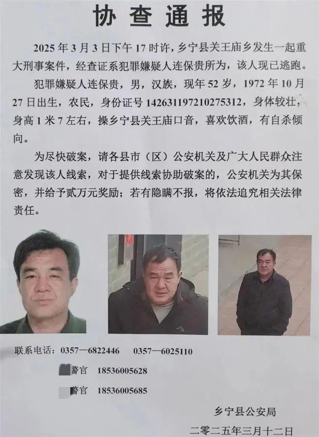 协查通报显示,2025年3月3日下午17时许,乡宁县关王庙乡发生一起重大刑事案件,经查证系犯罪嫌疑人连某某所为,该人现已逃跑。
