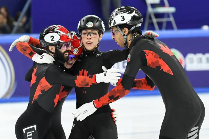 3月16日,加拿大队选手杜博伊斯(左一)、布廷(右二)、布鲁内尔(右一)和丹吉努在比赛后庆祝胜利。新华社记者 鞠焕宗 摄