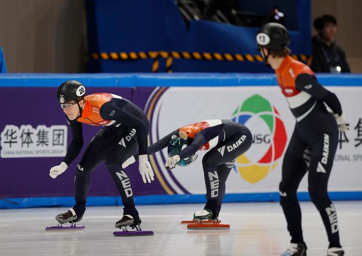 3月14日,荷兰队选手图恩·布尔(左)、桑德拉·贝尔塞伯在比赛中接力。当日,在北京举行的2025年国际滑联短道速滑世锦赛混合团体接力四分之一决赛中,荷兰队以2分35秒339的成绩打破世界纪录。新华社记者 丁旭 摄