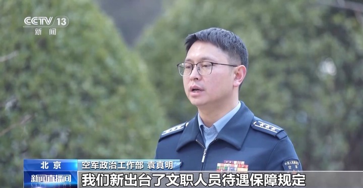空军政治工作部 袁真明:我们新出台了文职人员待遇保障规定,医疗方面,文职人员基本实现了免费就医,然后在住房方面,经军以上单位批准,可以租住公寓房、住宿舍。