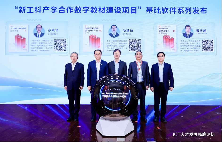 现场还发布了“新工科产学合作数字教材建设项目”基础软件系列,华为携手高等教育出版社、高校联合打造首批基础软件系列教材《人工智能原理与应用》、《数据库原理与应用-基于openGauss》、《openEuler操作系统教程》,该系列教程将突破传统纸质教材局限,更有力支撑资源动态更新、实现知识共享。