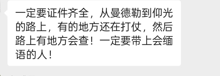 临近采访尾声,罗先生一再表示,他已经自救成功,可以把他拉进更多自救群,给还未离开的人分享撤离经验:“一定要和同胞们讲,去仰光的路上尽量组团,多几辆车一起走,人多抱团更安全。身上不要带贵重物品,这些东西都可以发快递,但身上一定要带现金,遇到关卡盘查,该给钱的地方就给,尽量在出发前找好关系。”