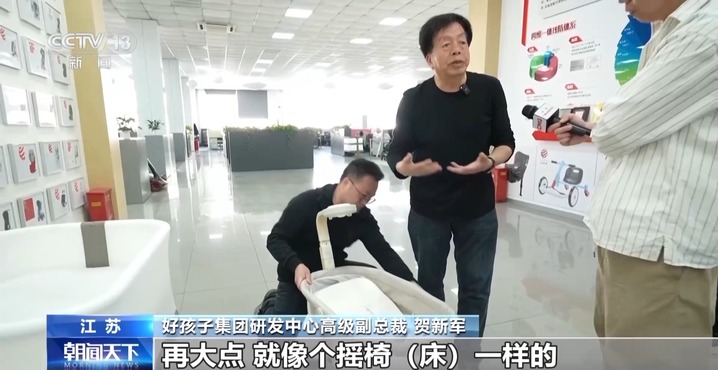 好孩子集团研发中心高级副总裁 贺新军:婴儿的时候,这款产品就是个睡篮,孩子再大点,就像个摇椅床一样,这个市场上是没有的,把我们原来的计划提前了半年。我们的每一个产品都有创新点,给消费者带来新的使用体验,他才愿意掏钱去买这个产品。