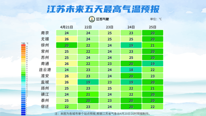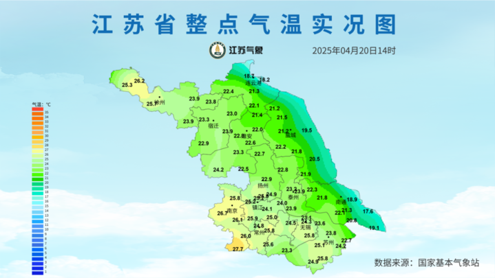 全省多云到晴。最高温度:本省东北部地区26~27℃,其他地区24~25℃;最低温度:本省东北部地区9℃左右,苏南地区14~15℃,其他地区11~12℃。全省偏北风3-4级。