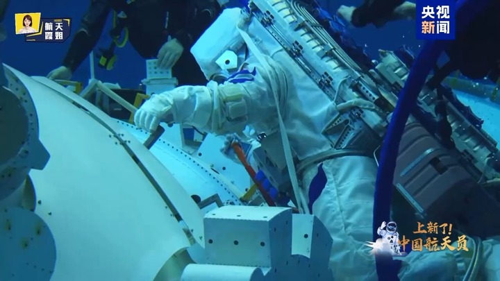 崔霞:这些训练,有些您一定不陌生。出舱活动训练中的模拟失重水槽训练大家最熟悉了。在训练时,航天员身着水下训练服,在模拟太空失重环境下,用双手控制身体姿态,要完成舱外转移、设备组装等操作。