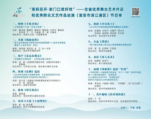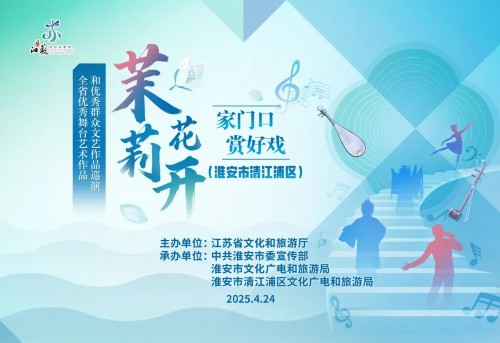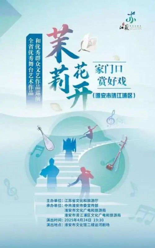 春风拂面茉莉香,文化盛宴到门旁!为深入贯彻党的二十届三中全会精神,让高雅艺术真正"飞入寻常百姓家",由江苏省文化和旅游厅主办的"茉莉花开·家门口赏好戏"全省优秀舞台艺术作品巡演列车,将于4月24日满载艺术芬芳驶入运河之畔的清江浦!这场汇聚全省文艺精粹的文化盛宴,将让千年运河文化与现代舞台艺术在清江浦交相辉映,奏响"文艺为人民"的动人乐章。