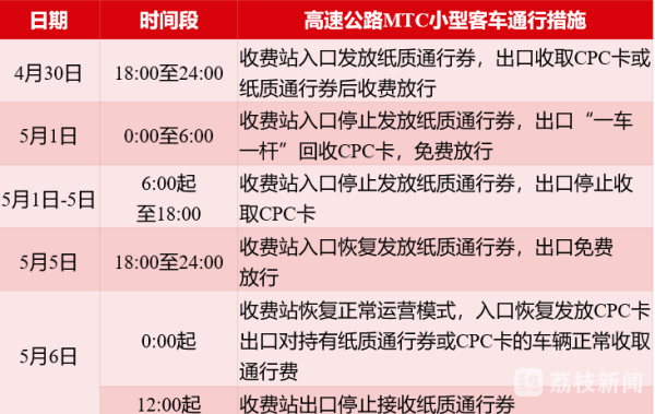 记者从江苏交通控股有限公司获悉,今年五一假期高速公路小型客车免费通行时段为5月1日0时至5日24时,共5天。免费截止时间以车辆驶离出口收费车道时间为准。免费通行对象为7座以下(含7座)载客车辆。ETC套装小型客车在免费时段内驶离出口车道的,系统自动按0元扣费。8座及以上客车、货车及客货两用车不享受免费政策。4月30日18时至24时,收费站入口发放纸质通行券,出口收取CPC卡或纸质通行券后正常收费放行。5月5日18时至24时,入口恢复发放纸质通行券,出口对符合免费条件的车辆免费放行。5月6日0时起,收费站恢复正常运营模式,入口发放CPC卡,出口对持有纸质通行券或CPC卡的车辆正常收费。免费时段结束前仍在高速行驶的车辆,建议根据位置和时间,就近选择收费站驶离,再重新驶入,既保障安全又最大限度享受免费政策。