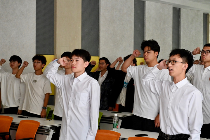 入团仪式在激昂的《义勇军进行曲》旋律中拉开帷幕,全体师生庄严肃立齐唱国歌。现场宣读新团员名单后,团委书记宗天煜为每位新团员佩戴团徽,并以“牢记团员使命”为主题作殷切寄语。在领誓人的带领下,新团员面向团旗庄严宣誓,铿锵有力的誓言回荡全场。智能241班宋峻石作为团员代表发言,承诺将以实际行动践行“勤奋学习、服务社会”的责任担当。最后,仪式在《光荣啊,中国共青团》的青春旋律中圆满落幕,标志着40名新团员正式“解锁”青春新身份。这场充满仪式感的活动,既展现了共青团组织的凝聚力,更激励着新时代青少年以奋斗之姿谱写青春华章。
