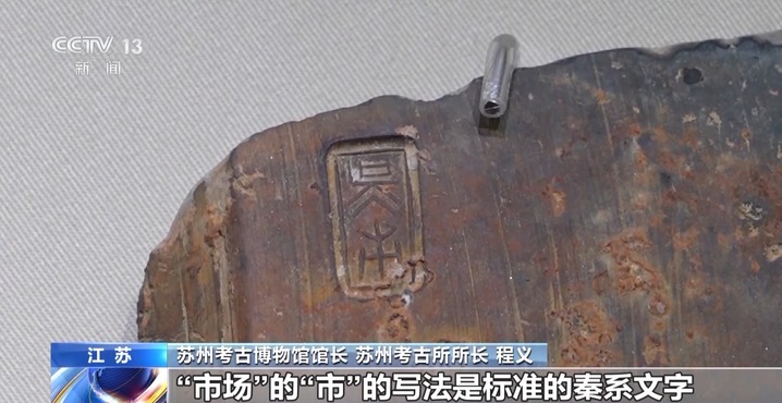 苏州考古博物馆馆长 苏州考古所所长 程义:“吴市”陶片,在我们这就是非常重要的一件展品,因为它有“吴市”两个字。“市场”的“市”的写法是标准的秦系文字,这样我们就确认这件东西是秦代的。过去我们讲六国文字异形,到秦统一以后要书同文,把过去的六国文字要统一起来,用秦系的小篆作为标准字体,那么这个“市”的写法就是标准的秦系文字。