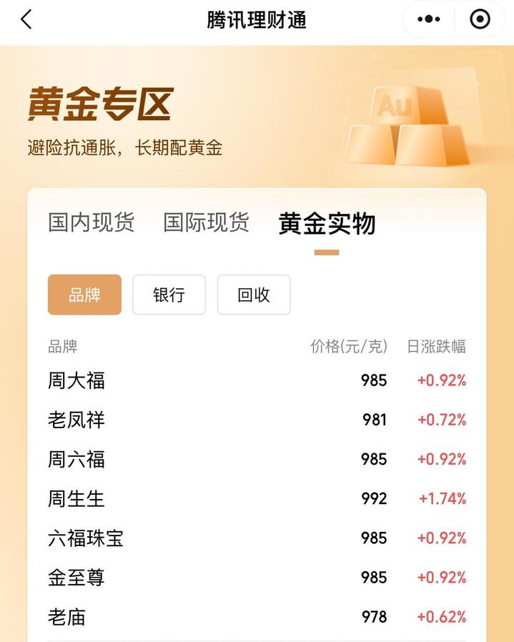 国内金饰价格随之变化,品牌金饰单克价格集体回落至千元以下。其中,周大福足金饰品标价985元/克,周生生足金饰品标价992元/克,均较昨日有所反弹。