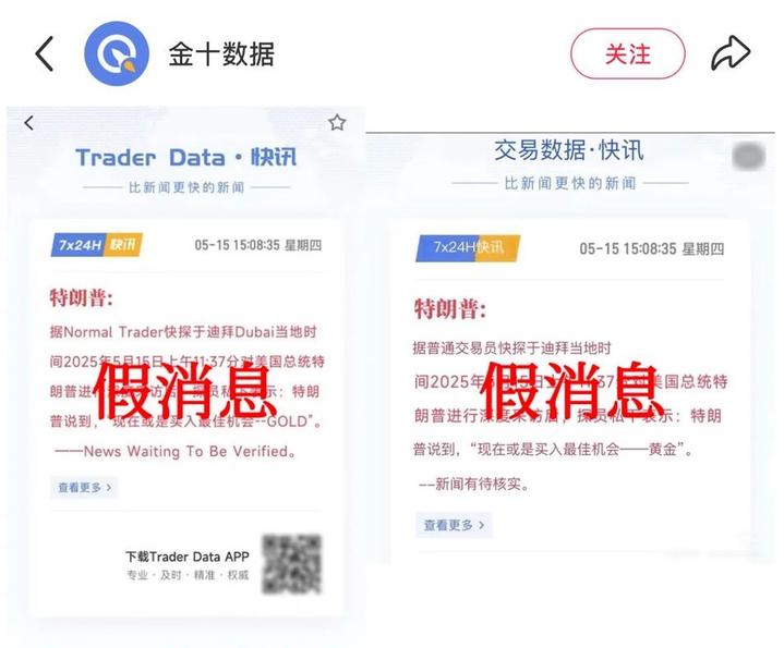 昨日,社交网站上流传一张快讯截图,内容为特朗普表示:“现在或是买入黄金的最佳机会”。随后涉事资讯平台发布辟谣声明称,该截图风格与我司旗下金十数据APP的快讯卡片类似。经我司严格核查,确认该信息系伪造,我司从未发布相关内容,且该图片存在明显的篡改痕迹。在此提醒广大投资者提高警惕,注意辨别信息真伪,切勿轻信网络谣言。
