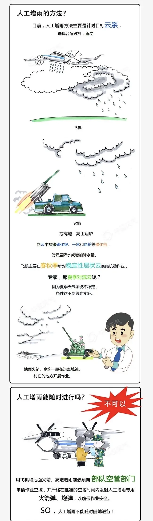 此外,也不是所有的云都可以用来“播雨”的,有雨必先有云,但是有云不一定有雨。晴天或天上的云很薄是不具备人工增雨作业条件的。