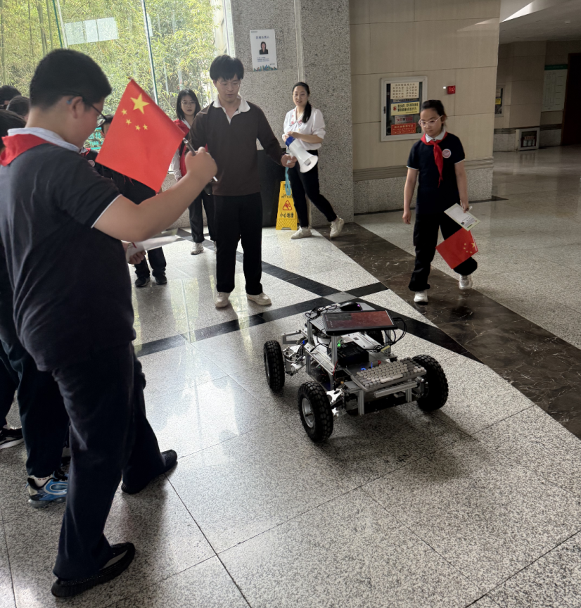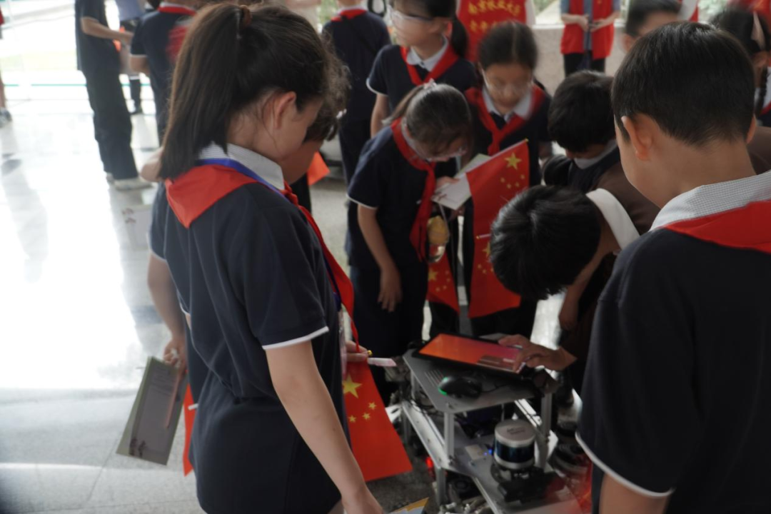 在逸夫楼,少先队员们与大学生志愿者共同探索互动机器人。在编程演示与操作体验中,孩子们的目光紧紧追随感应机器人的动作,对科技创新的向往溢于言表,心中悄悄埋下对未来世界不断探索的种子。