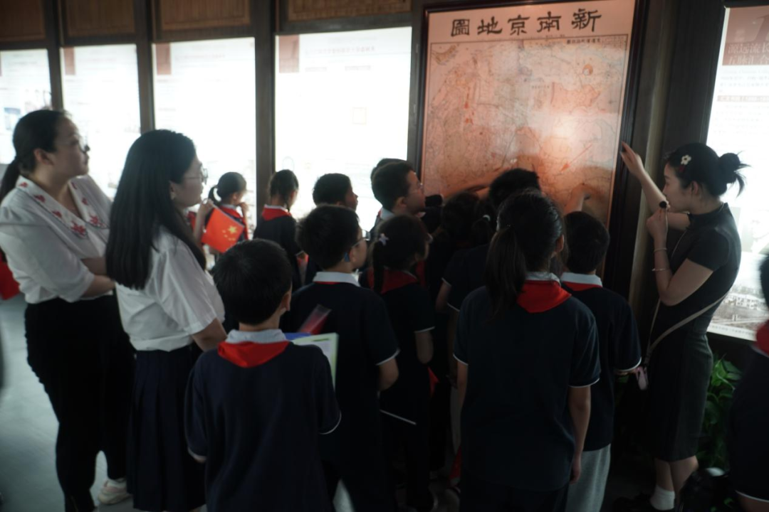 少先队员在党员教师、南林大大学生志愿者带领下,以“红色校史寻访者”的身份开启研学之旅。从第九教学楼出发,首站到达刻有“诚朴雄伟,树木树人”校训的转盘,这座见证南林百年历程的地标,不仅承载着“育人为本”的初心,更镌刻着师生们“听党话,跟党走”的奋斗印记。