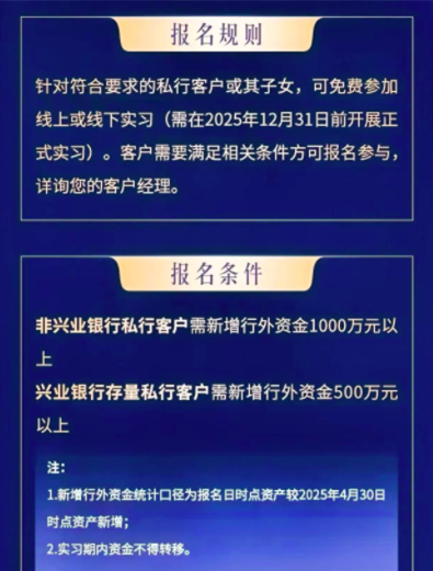 近日,有网友爆料称,兴业银行私人银行推出一项实习计划,可以为客户子女提供知名企业实习机会,报名条件是“非私行客户新增资金1000万元以上,存量私行客户新增资金500万元以上”,并且要求实习期内资金不得转移。相关媒体从兴业银行部分地区私人银行中心了解到,确实有上述实习计划,报名已于上周结束。