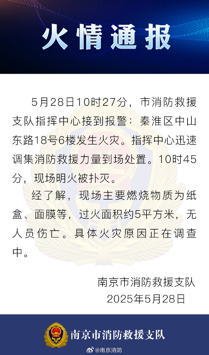 28日下午,南京市消防救援支队发布火情通报称,5月28日10时27分,市消防救援支队指挥中心接到报警,南京秦淮区中山东路18号6楼发生火灾。指挥中心迅速调集消防救援力量到场处置。10时45分,现场明火被扑灭。经了解,现场主要燃烧物质为纸盒、面膜等,过火面积约5平方米,无人员伤亡。具体火灾原因正在调查中。