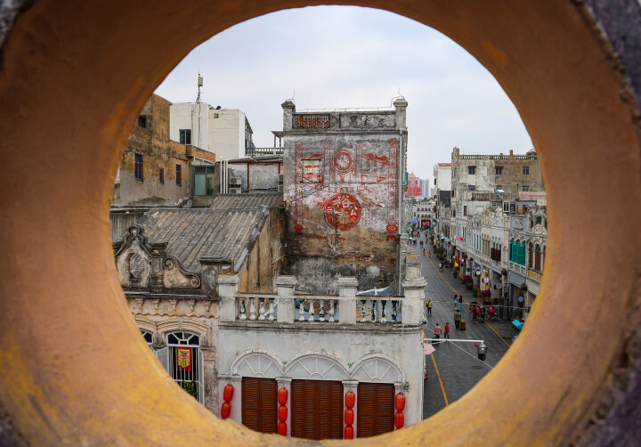 5月26日,游客登高俯瞰骑楼老街并拍照留念。记者 曹雪文 摄