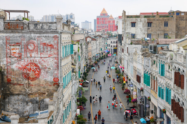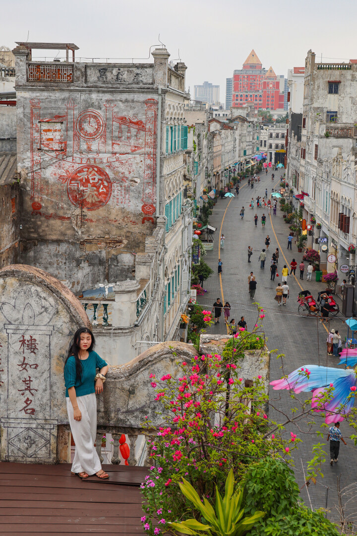 5月26日,海口骑楼老街热闹非凡。游客穿行其中,感受着骑楼浓郁的南洋风情。记者 曹雪文 摄