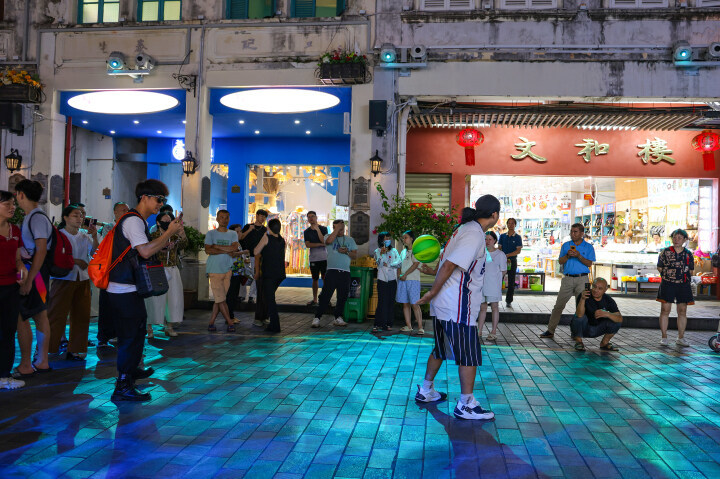 5月26日晚,海口骑楼老街内,两位现在直播的年轻人在展示篮球技巧,吸引了许多往来的游客驻足观看。记者 曹雪文 摄