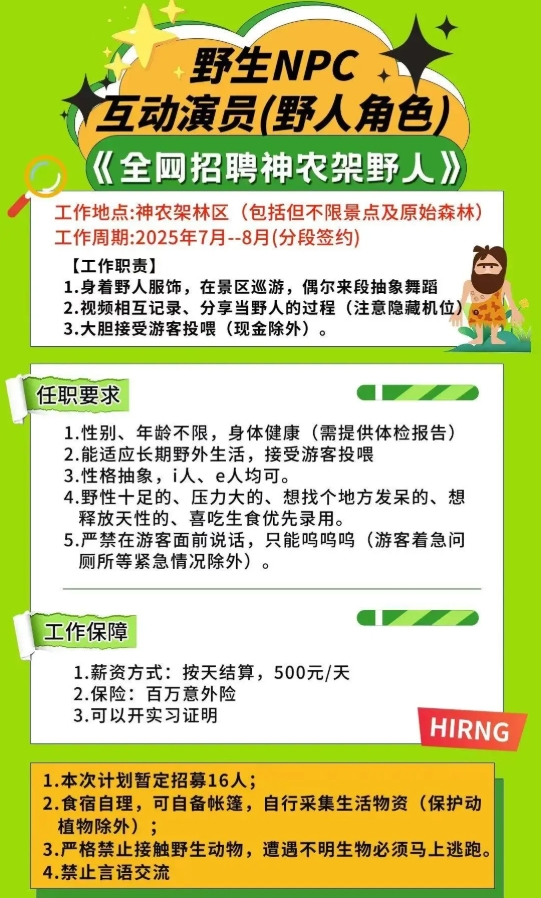 日薪500元、不限年龄性别、主打释放天性……日前,神农架“野人招聘”信息迅速在社交平台掀起讨论热潮,短短两天内吸引近4000人报名。