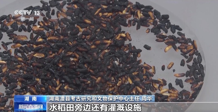 湖南澧县考古研究和文物保护中心主任 周华:这个是在遗址内发现有着5000多年历史的炭化稻米,水稻田旁边还有灌溉设施,证明一整套农业系统循环已经很成熟了。作为当时的先民来讲,已经能够在遗址的范围内开展由游猎生活转变为相对稳定的农耕生活了。