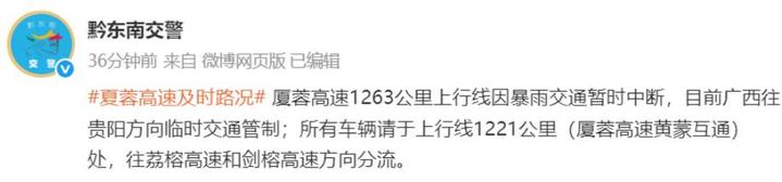 据贵州省黔东南州公安局交通警察支队官方微博消息,厦蓉高速1263公里上行线因暴雨交通暂时中断,目前广西往贵阳方向临时交通管制;所有车辆请于上行线1221公里(厦蓉高速黄蒙互通)处,往荔榕高速和剑榕高速方向分流。