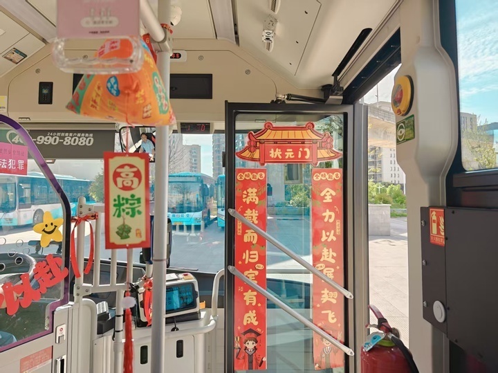 66路、666路、166路、678路等线路的公交车厢,即将变身“元气加油站”!车厢内部悬挂祝福标语、点缀象征“一举夺魁”的向日葵。高考期间,211路公交车还将变身爱心护考驿站停靠在南师附中秦淮科技高中考场外,守护高考学子。