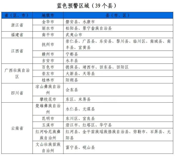 预计,6月8日20时至6月9日20时,浙江南部、福建北部、广西东北部、四川南部、云南中部和东部等地部分地区发生山洪灾害可能性较大(黄色预警),其中,浙江南部、福建北部局地发生山洪灾害可能性大(橙色预警),预警区域涉及的县(市、区)见下表。其他地区也可能因局地短历时强降水引发山洪灾害,请各地注意做好实时监测、防汛预警和转移避险等防范工作。