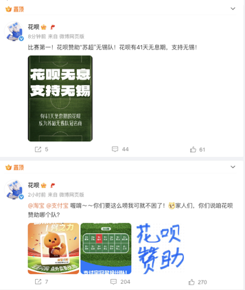 花呗也第三个加入“战场”,官宣赞助无锡队,还拿出了谐音梗“花呗无锡,支持无锡”。