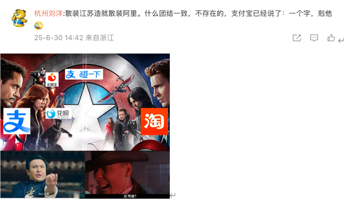 这一“混战”事件迅速上了热搜,网友们纷纷前排吃瓜,造梗 “散装阿里”,还不忘拉阿里系其他品牌下水。余额宝作为“国民理财神器”更是被cue了多次。