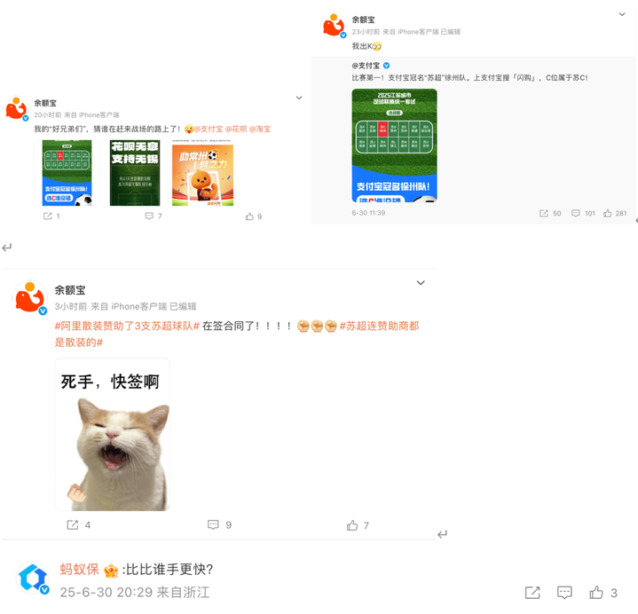 据悉,由于和扬州队的赞助合同还没签完,余额宝昨天没能赶上集体官宣,急得只能连发多条微博,“暗戳戳”暗示自己也下场赞助了。蚂蚁保也不甘示弱,在评论区“挑衅”余额宝“比谁出手快”,但如今被余额宝拿下第四名。