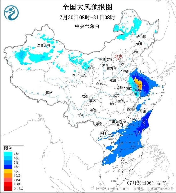 预计,7月30日08时至31日08时,内蒙古西部和东北部、新疆东部和南疆盆地、青海北部和西部、甘肃河西、上海、浙江北部、江苏中南部等地有5~6级、阵风7级的大风,其中,上海、浙江北部、江苏中南部等地部分地区有7~8级、阵风9~10级的大风;黄海中西部和南部海域、东海北部海域、台湾以东洋面、巴士海峡将有7~8级、阵风9~10级的大风,其中黄海西南部海域、东海西北部海域风力可达9~10级、阵风11~12级,东海西南部海域、南海大部海域将有7级、阵风8级的西南风。