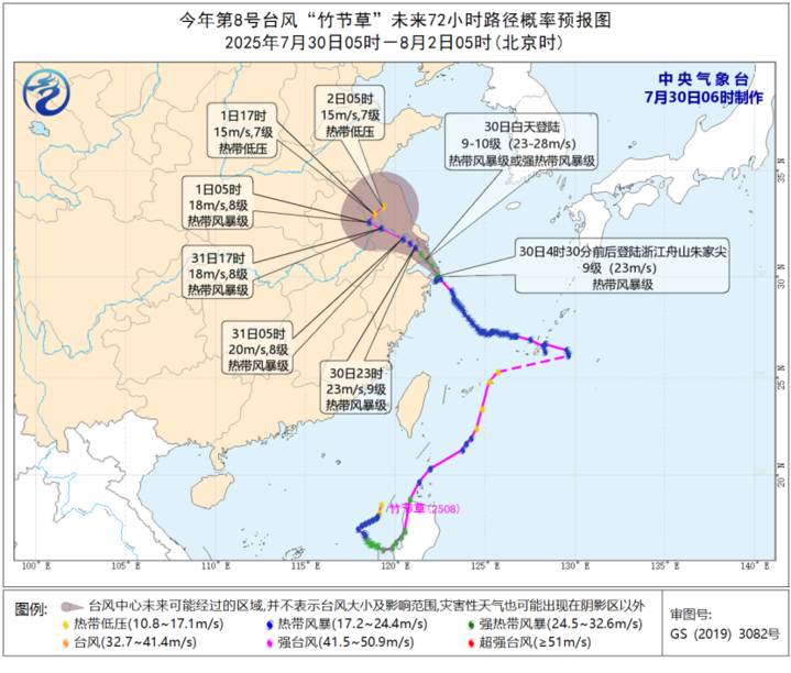 今年第8号台风“竹节草”(热带风暴级)的中心已于今天(30日)早晨4时30分前后在浙江省舟山市朱家尖岛沿海登陆,登陆时中心附近最大风力有9级(23米/秒),中心最低气压为975百帕。早晨5点钟其位于浙江省舟山市近海海面上,就是北纬29.8度、东经122.2度,中心附近最大风力有9级(23米/秒),中心最低气压为975百帕,七级风圈半径100-300公里。