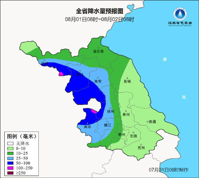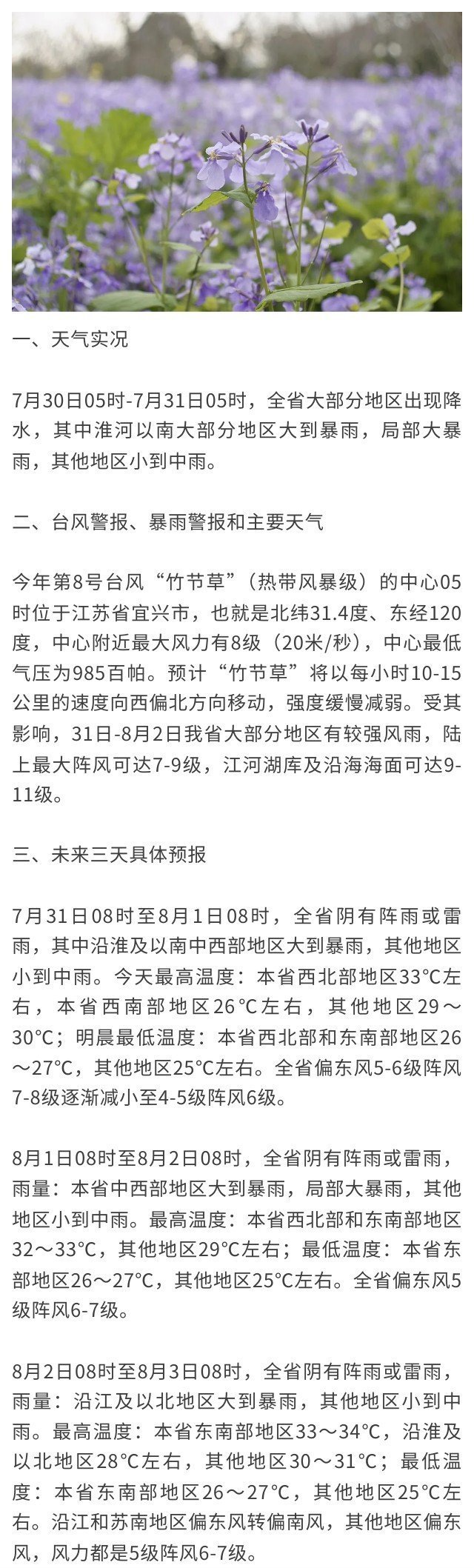 受其影响,31日-8月2日我省大部分地区有较强风雨,陆上最大阵风可达7-9级,江河湖库及沿海海面可达9-11级】7月31日08时至8月1日08时,全省阴有阵雨或雷雨,其中沿淮及以南中西部地区大到暴雨,其他地区小到中雨。今天最高温度:本省西北部地区33℃左右,本省西南部地区26℃左右,其他地区29~30℃;明晨最低温度:本省西北部和东南部地区26~27℃,其他地区25℃左右。全省偏东风5-6级阵风7-8级逐渐减小至4-5级阵风6级。