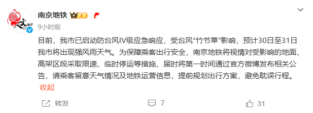 南京地铁:目前,南京市已启动防台风IV级应急响应,受台风“竹节草”影响,预计30日至31日南京市将出现强风雨天气。为保障乘客出行安全,南京地铁将视情对受影响的地面、高架区段采取限速、临时停运等措施,届时将第一时间通过官方微博发布相关公告,请乘客留意天气情况及地铁运营信息,提前规划出行方案,避免耽误行程。