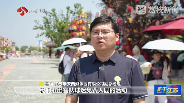 这个周末,淮安各地景区也都开启实力宠粉模式。西游乐园景区除了开放免票入园的预约通道,还创新推出“足球主题市集”。为了应对高温天气,景区提前打开雾森系统给游客降温,免费提供绿豆汤和清凉贴。同时推出夏日夜场夜游活动,通过主题演出、无人机烟火秀等活动,提升游客的游玩体验,有效地把“苏超”流量转化为“文旅增量”。
