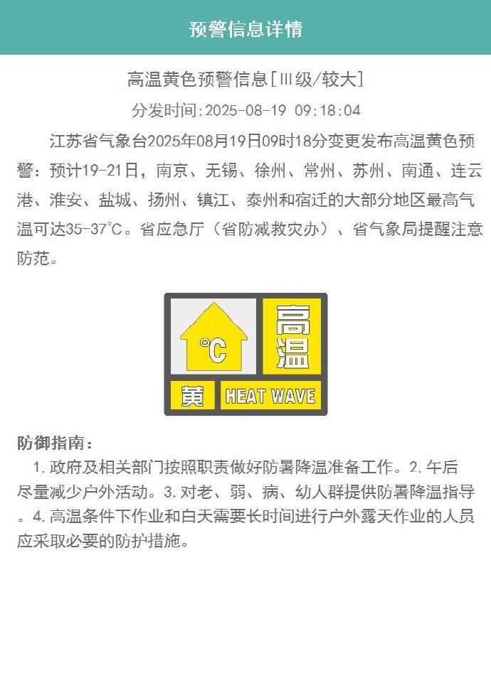 江苏省气象台2025年08月19日09时18分变更发布高温黄色预警:预计19-21日,南京、无锡、徐州、常州、苏州、南通、连云港、淮安、盐城、扬州、镇江、泰州和宿迁的大部分地区最高气温可达35-37℃。省应急厅(省防减救灾办)、省气象局提醒注意防范。