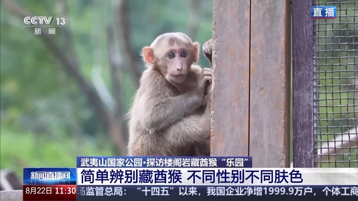 总台记者 郭紫约:我就在武夷山国家公园楼阁岩的半山腰处,岩体的凹陷留出了一块有遮挡的平台,也让这里成了一群猴子栖息玩耍的地方。现在在我身后可以看到有很多猴子聚集在一起,特别的可爱。它们都是藏酋猴。如何在外观上辨别它们呢?一个很明显的特征就是藏酋猴的尾巴比较短,体形也比其他猴子粗壮。