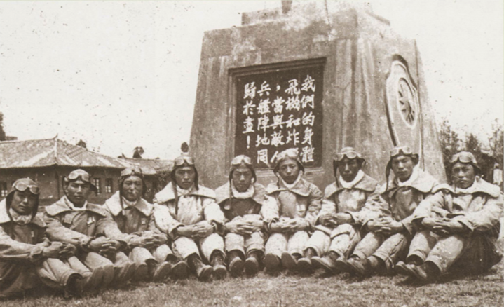 飞行员与立在笕桥中央航校的校训合影