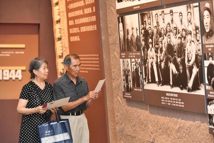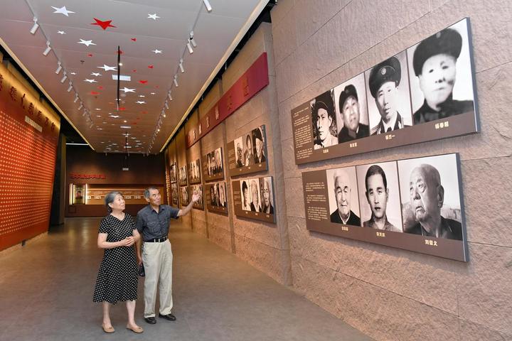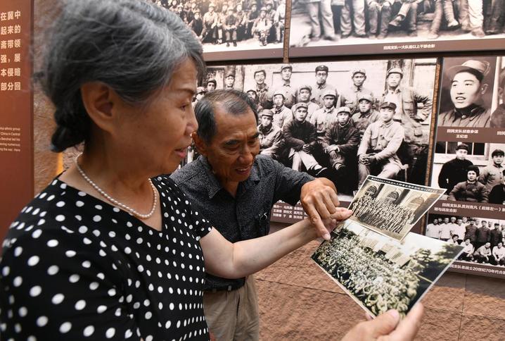 7月8日,杨光明(右)、杨若梅在马本斋纪念馆内通过照片讲述回民支队的故事。和平年代,回民支队团结一致、英勇善战的故事被人们传颂。杨光明回忆:“1959年电影《回民支队》放映后,院里的孩子们都跑到家里来,缠着父亲讲回民支队的故事。”从那之后,杨杰一常给孩子们讲述战斗故事,弘扬革命精神,传扬民族友谊。