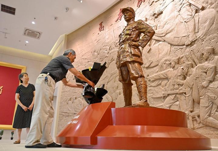 7月8日,杨光明(右)、杨若梅在马本斋纪念馆内向马本斋塑像献花。
